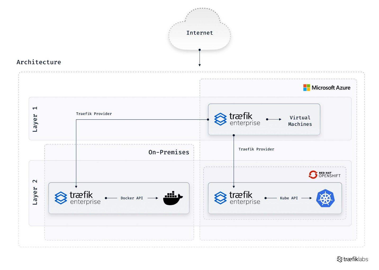 AmeriSave built a two-layer architecture that allows them to transition to Kubernetes while still running production environments in Docker (see diagram below). The Traefik Provider feature allows Traefik's API Gateway to route requests to other Traefik API Gateway instances. With hybrid support for legacy and cloud native applications, AmeriSave can transfer traffic seamlessly at high throughput between microservices deployed in Docker Swarm on-prem and microservices deployed in OpenShift on Microsoft Azure.