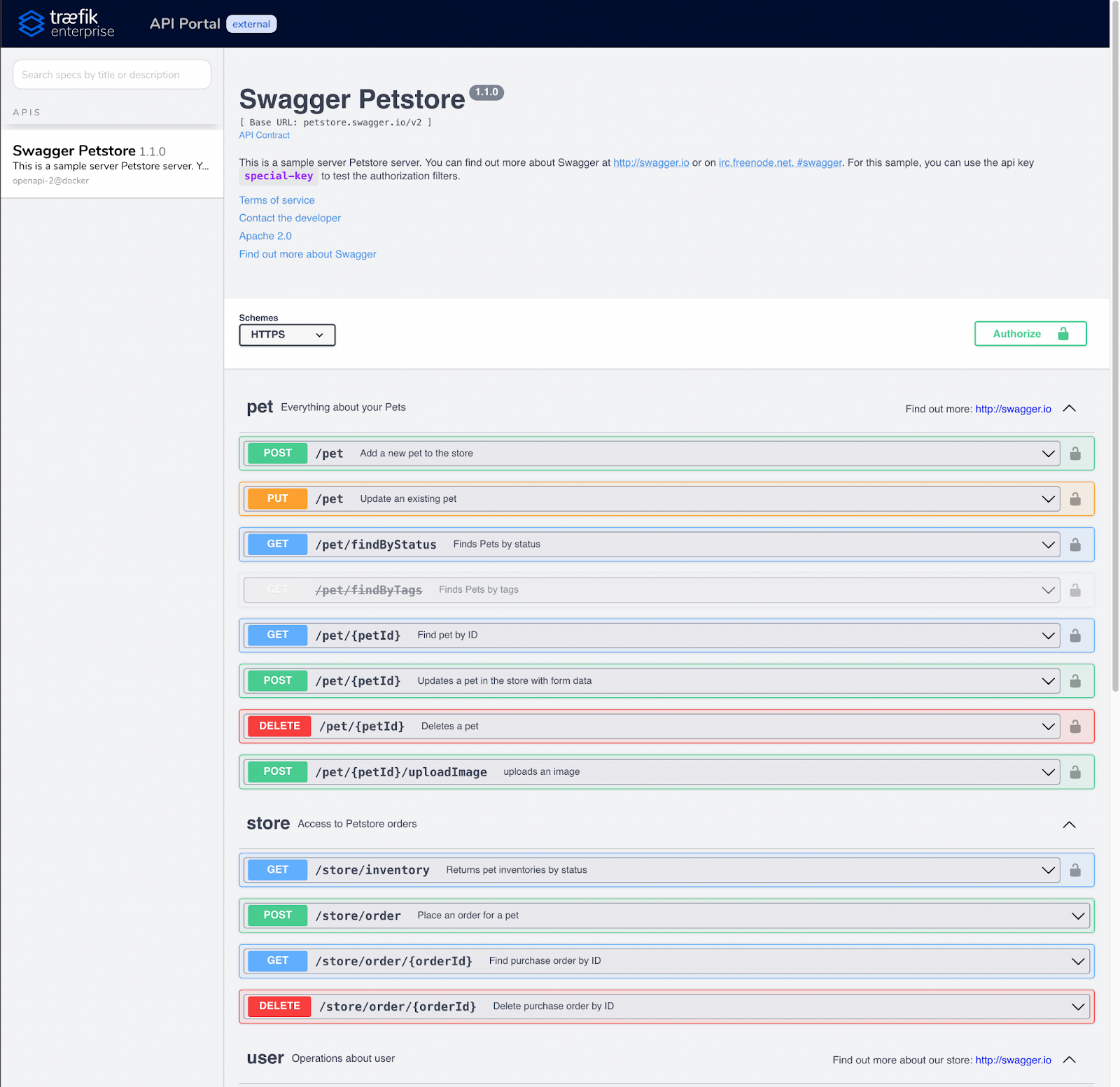 Traefik Enterprise then dynamically creates new API Portals for each group that is referenced this way. You can configure the path to the endpoint serving the API specification file for each group. Groups that do not set an explicit path default to the path of the service, if set, or to the one defined in the static configuration.