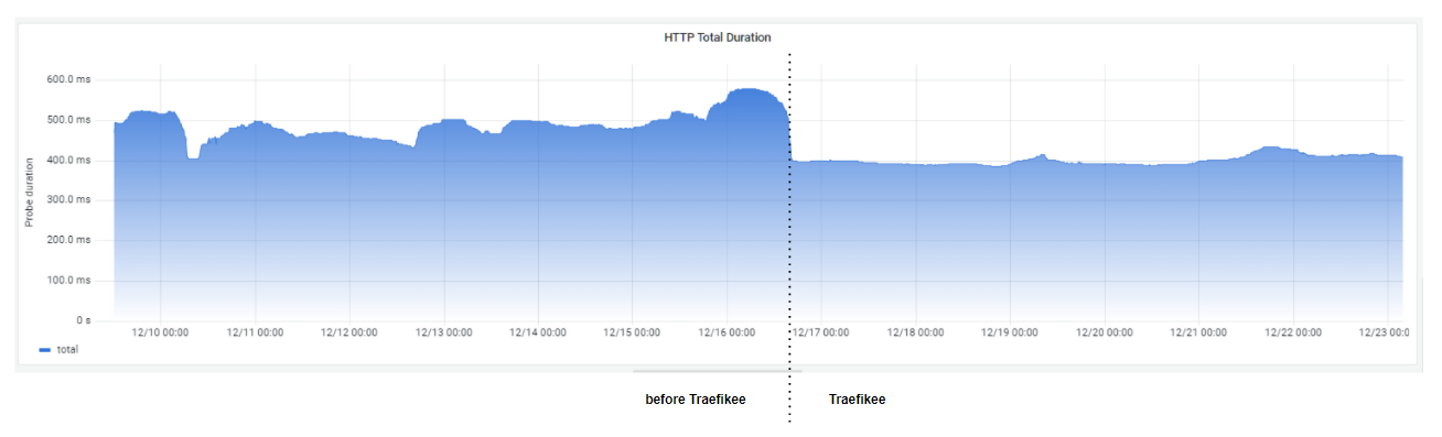 Traefik’s architecture has also increased the performance of Axione’s applications. Immediately after deploying some applications behind Traefik, Axione saw significant performance and latency improvements (about 20%) compared to running the same applications behind Nginx (visualized below).