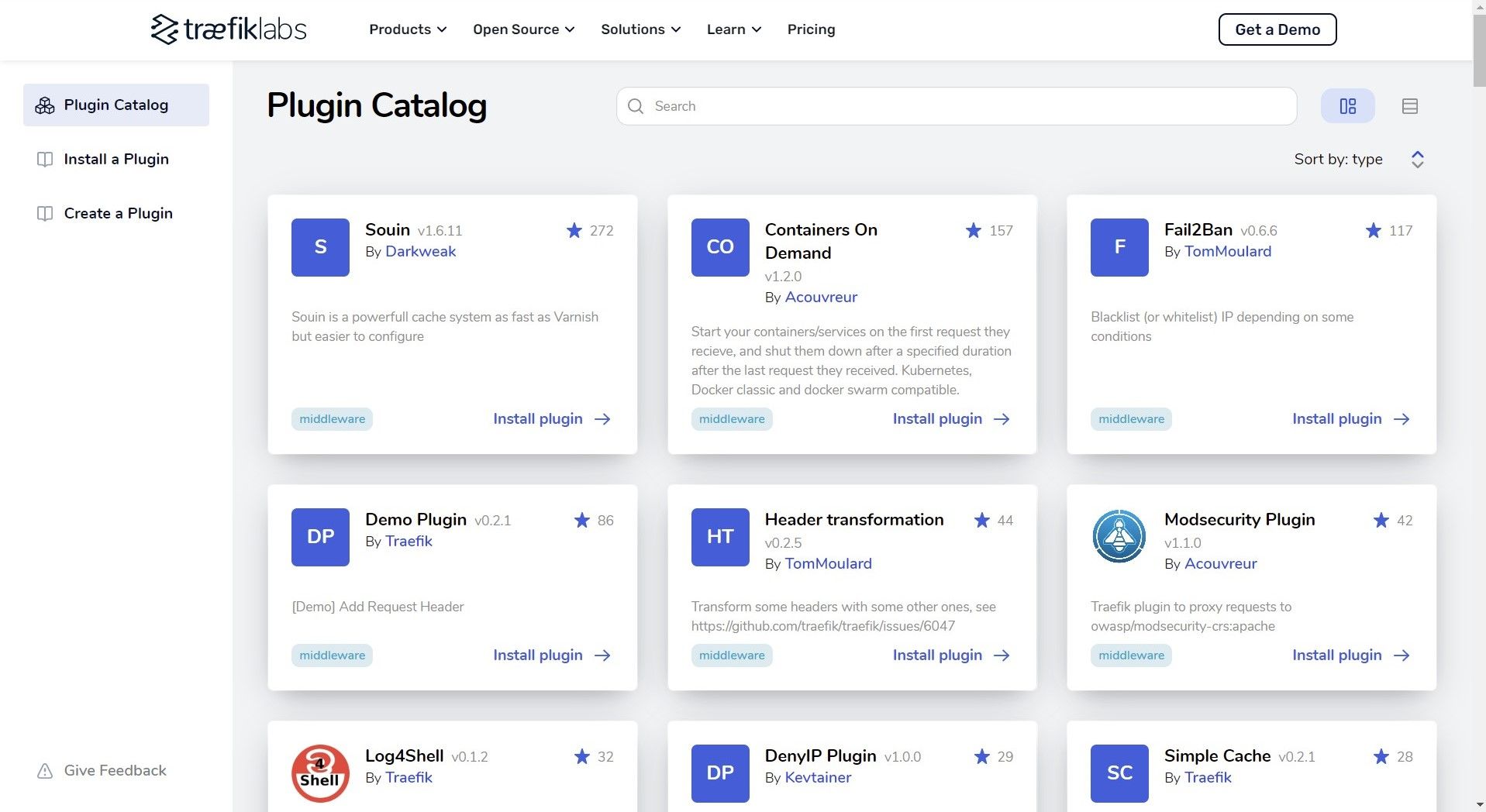 The Plugin Catalog is where users can find all of the available Traefik plugins and the information related to them. The Plugin Catalog is directly accessible from the Traefik dashboard (from Traefik Proxy 2.8 onward) and from the Traefik Labs homepage.