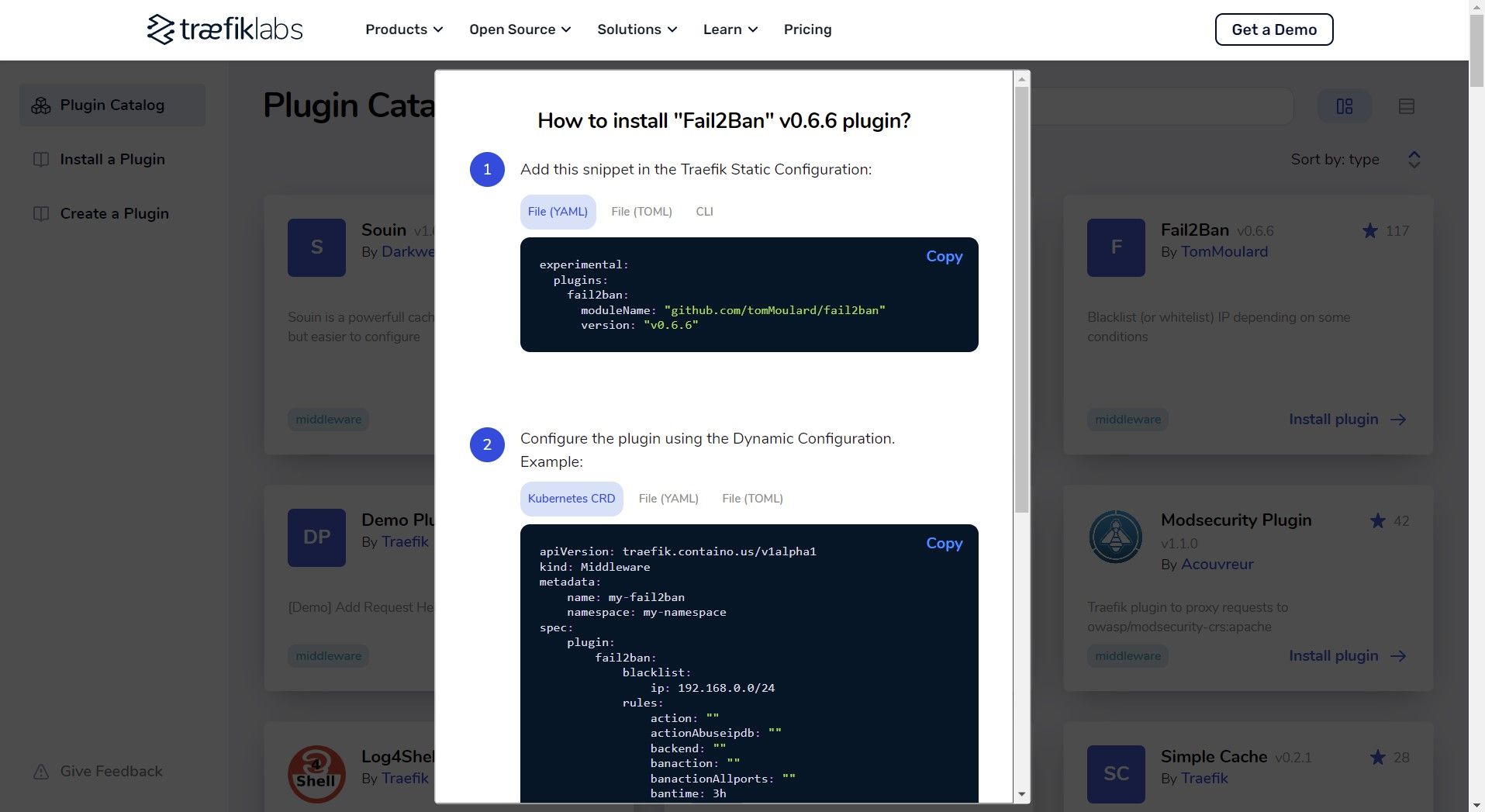 You can get all of the necessary code to install the plugins directly from the Plugin Catalog. Note that it is not possible to start a new plugin or modify an existing one while Traefik is running; you’ll need to restart your Traefik instances after installing or modifying a plugin.