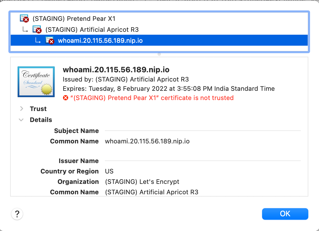 Make that change, and then deploy the updated IngressRoute configuration. Reload the application in the browser, and view the certificate details.