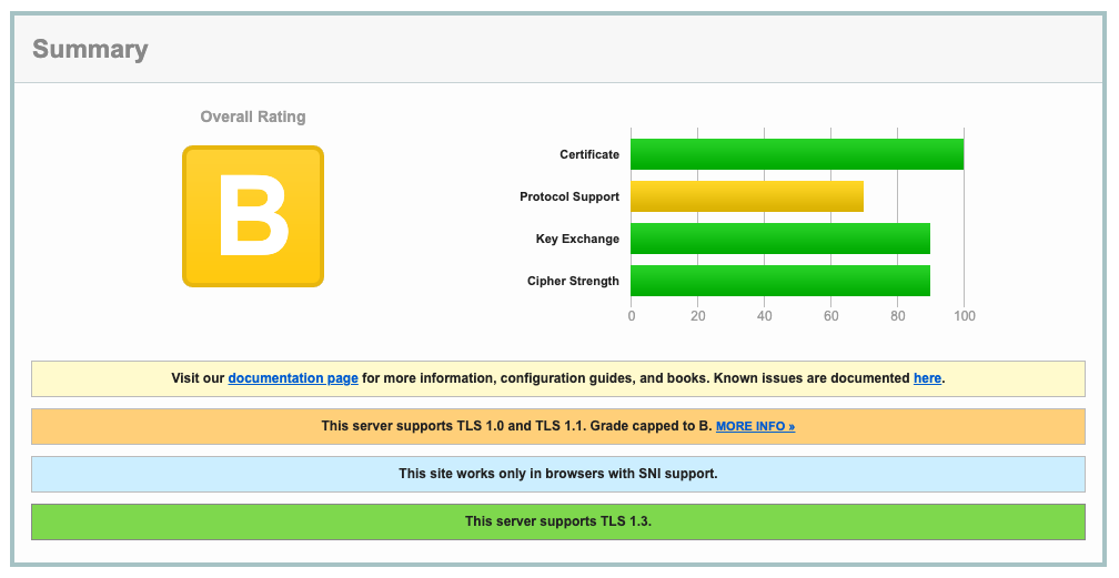 Before you enable these options, perform an analysis of the TLS handshake using SSLLabs. The SSLLabs service provides a detailed report of various aspects of TLS, along with a color-coded report.