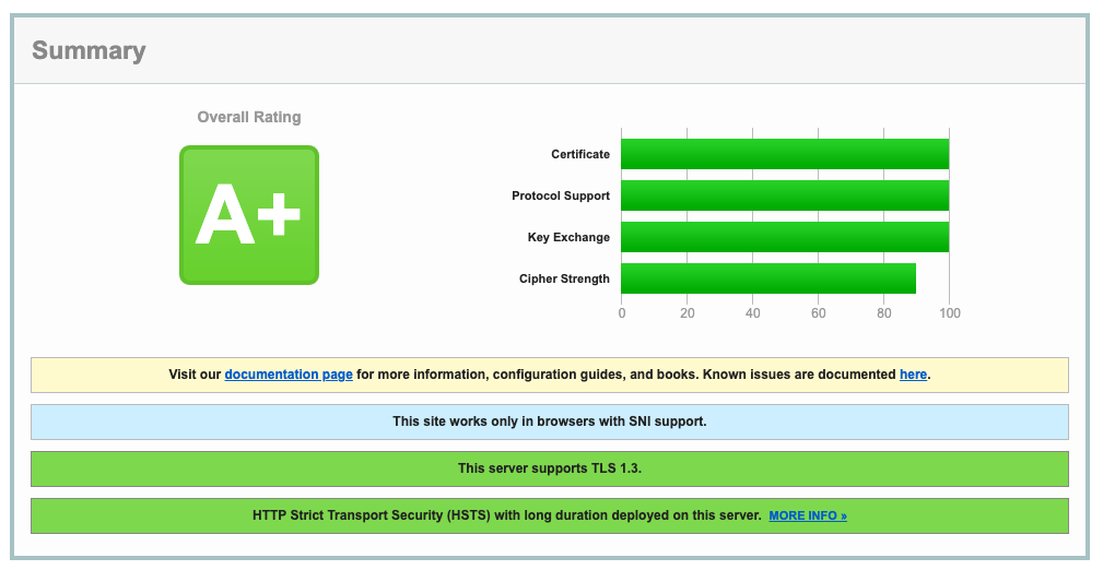 Apply this configuration to create the Middleware and update the IngressRoute, and then generate a new report from SSLLabs. The configuration now reflects the highest standards in TLS security.