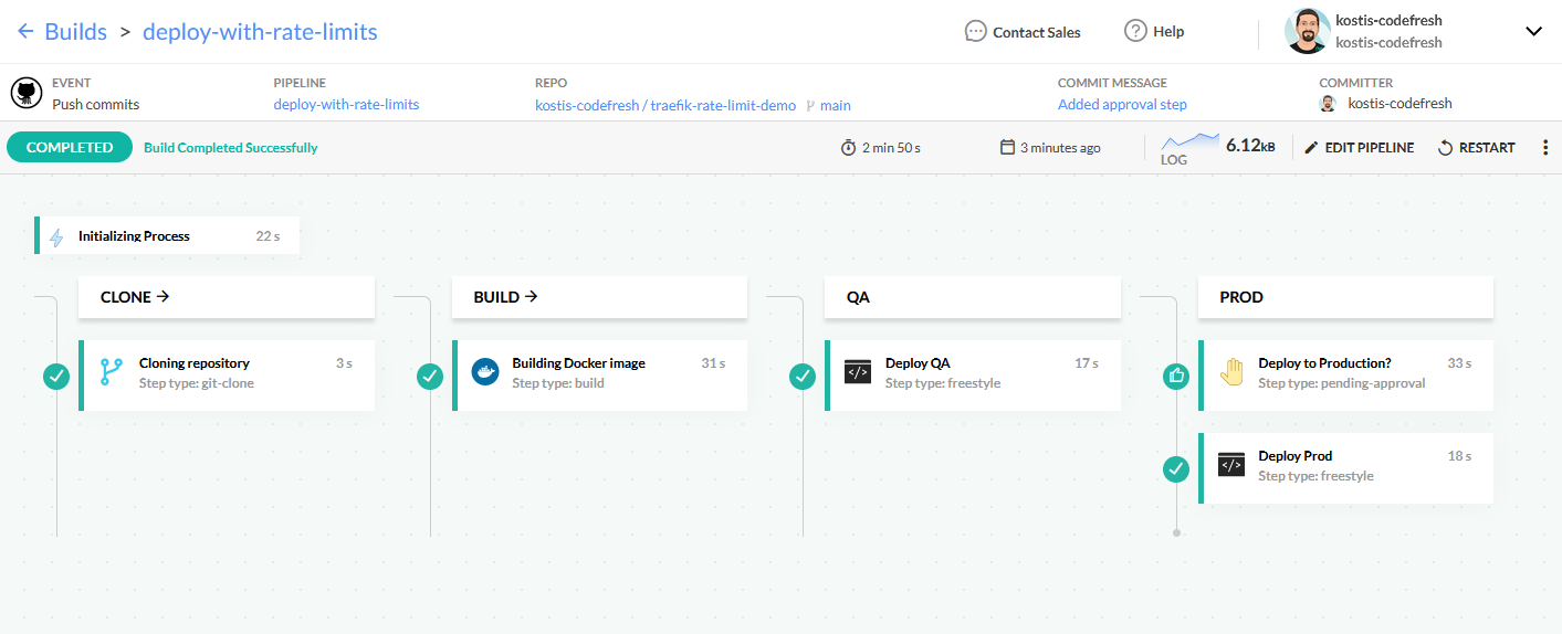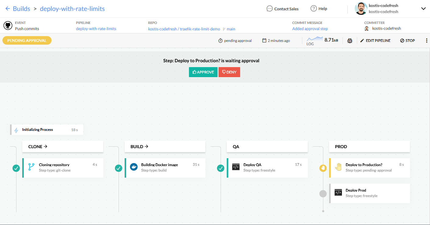 At this point, the pipeline stops and waits for manual approval before deploying to production. You can find more information about Codefresh pipelines in the documentation of pipeline steps.