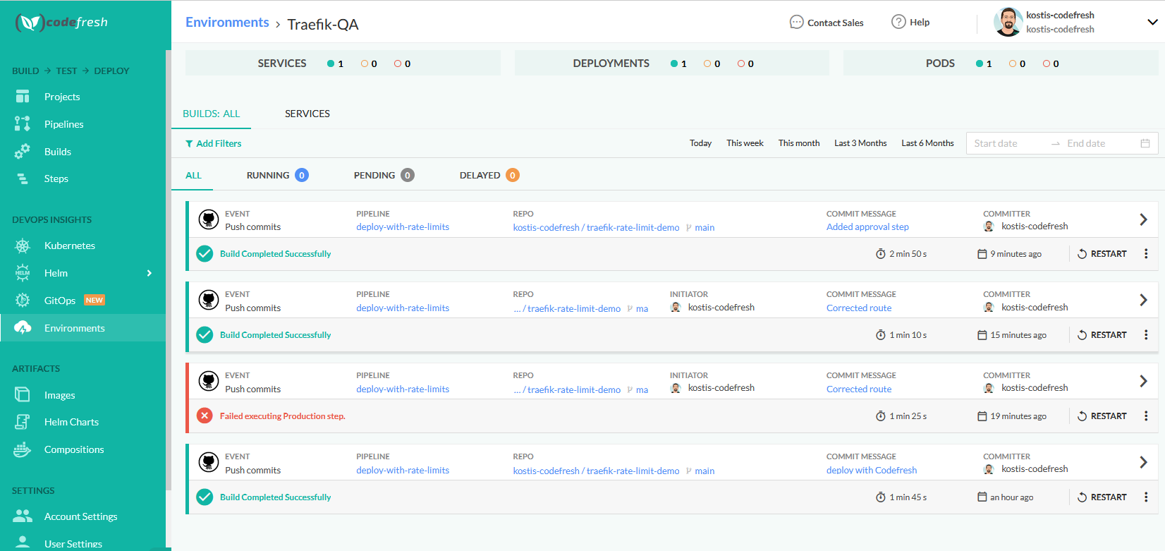 To test rate limiting, we could again use kubectl to manually install everything in our cluster. It is much better, however, to fully automate the process. In this example, we use Codefresh, a deployment platform specifically for Kubernetes applications.