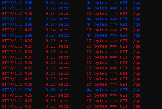 Everything now works as expected. You can try different combinations of siege parameters in both environments. As an exercise, try making the production environment return HTTP 429 to your siege command.