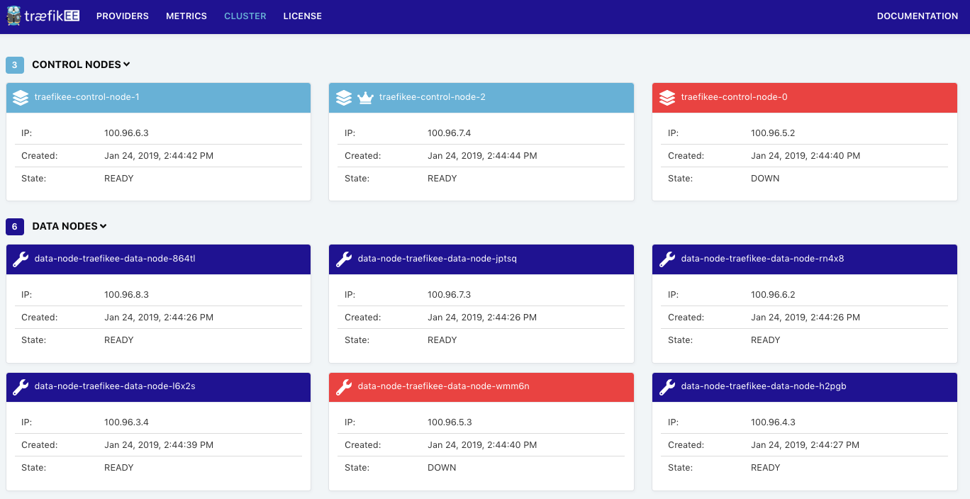 $ aws ec2 reboot-instances --instance-ids=i-0fdc6a4f95908a2baThe Dashboard immediately reports that a control node and a data node are unhealthy ( traefikee-control-node-0 and data-node-traefikee-wmm6n in this case):