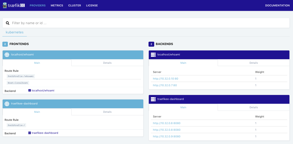 $ kubectl apply -f https://gist.githubusercontent.com/dduportal/ad5e68ffcd9e39c65bdf4af7224304a0/raw/8b87143b084c612f86d66f587df7c058c7fa1aa0/whoami.yamlCheck the dashboard again. After a few seconds, the routing configuration for the application “whoami” is automatically picked by TraefikEE from Kubernetes: a frontend and 2 associated backends (the 2 replicas).
