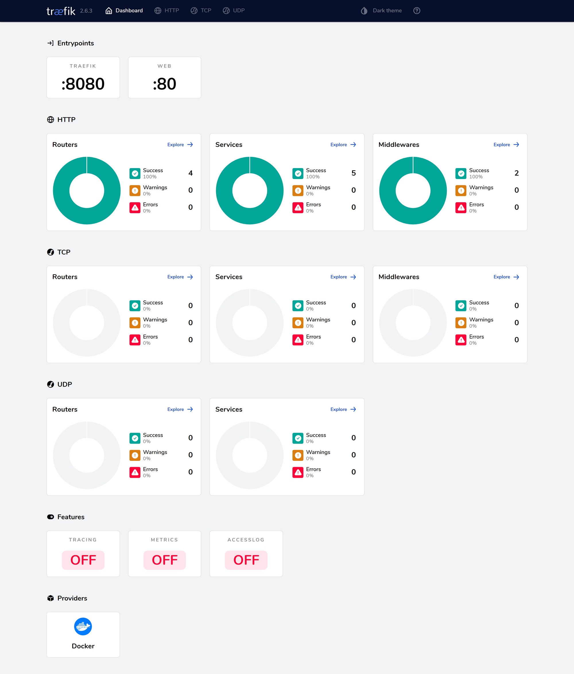 Because I always enjoy seeing what I’m working on, let’s first enable the Traefik dashboard in development mode. All you need to do is to add one argument to the Traefik command itself: