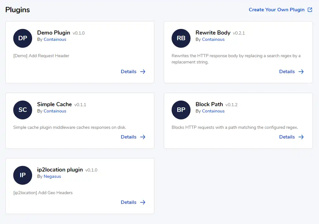 Traefik now allows the use of plugins as well. The list is currently rather small, but I do not doubt that the catalog will snowball as the community begins publishing its creations!