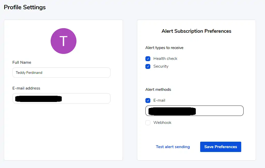 By clicking on your profile name at the top right, it is possible to define alarms, via webhooks or by e-mail.