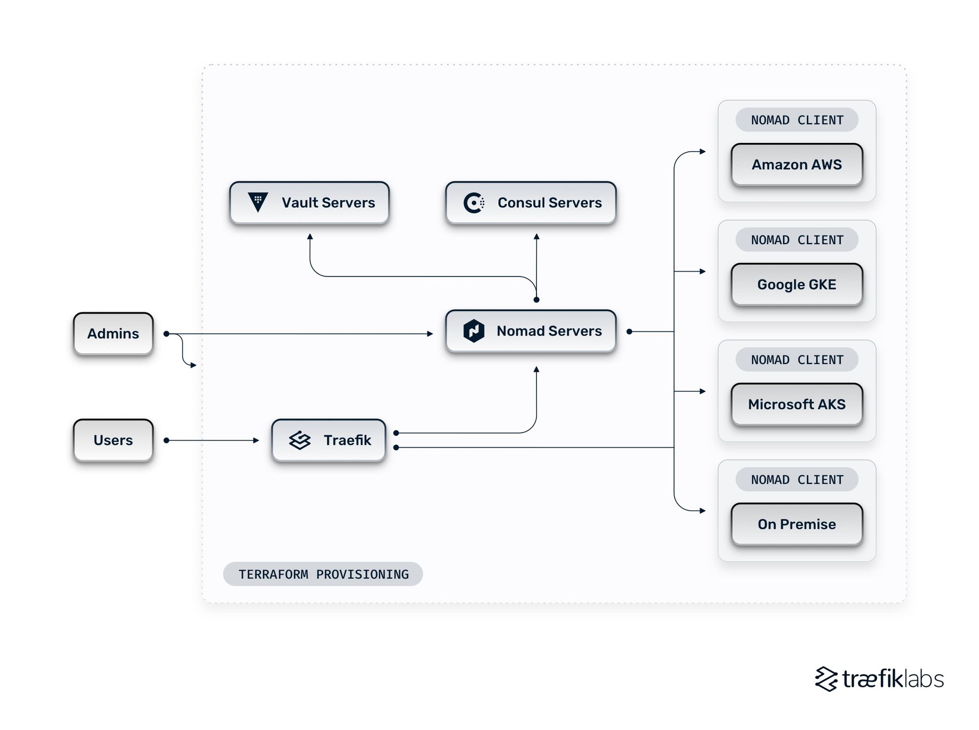 Nomad integrates easily with other HashiCorp solutions, and it often works well for organizations to build their architecture around HashiCorp. System administrators can rapidly provision infrastructure with HashiCorp Terraform. Users can use the services deployed by connecting with Nomad servers that can then integrate with Vault and Consul servers. HashiCorp Consul automates network configurations and service discovery and is a K/V store. HashiCorp Vault generates and stores TLS certificates as well as performing secrets management. With Nomad as the scheduler, system administrators can maintain definitions for multiple types of environments from the same place. The Nomad servers can connect with Nomad clients that live within different types of environments.